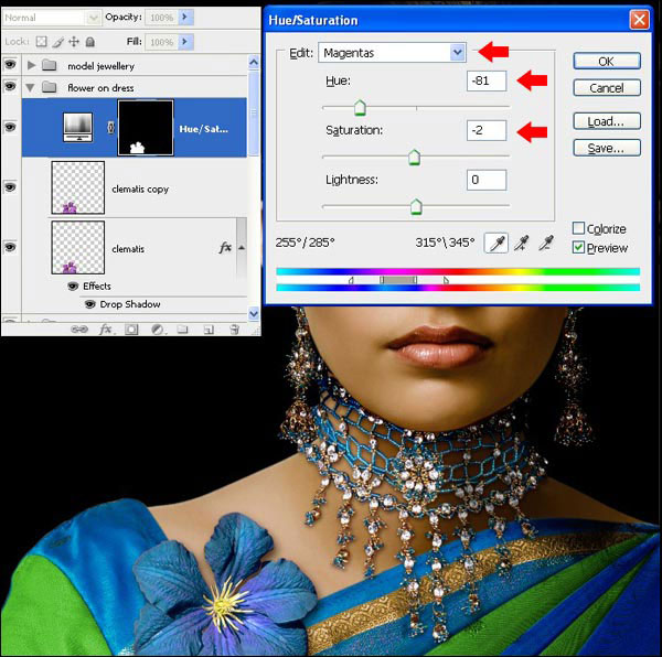 Скорректировав размер цветка, расположите его на платье, как показано ниже. Дублируйте и примените к дубликату режим наложения Multiply (Умножение) c Opacity (непрозрачность) 23%. Зажав клавишу Ctrl, нажмите на нижний слой с цветком, для создания выделения, затем добавьте корректирующий слой Hue/Saturation (Цветовой тон/Насыщенность) с настройками, как на скриншоте ниже.