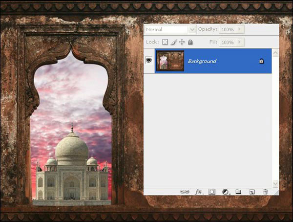 Назовите этот слой «Окно», а затем дублируйте его и измените режим наложения на Multiply (Умножение) c Opacity (Непрозрачность) 44%. Откройте изображение с Тадж-Махалом, затем выделите его при помощи Magic Wand Tool