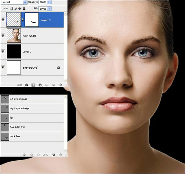 (Кисть) размером 100px. Затем пройдитесь ею на маске по жесткому краю в нижней части шеи, чтобы плавно соединить с остальной кожей, и, наконец, нажмите Ctrl+E, чтобы слить слои вместе.
