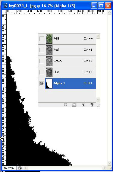Откройте изображение «Плющ» и «ivy alpha channel» из папки Source. Нажмите Ctrl+A на изображении «ivy alpha channel», затем скопируйте его и перейдите к изображению «Плющ». Добавьте новый канал в палитре каналов и нажмите Shift + Ctrl + V, чтобы вставить выделение плюща в альфа-канал. Удерживая Ctrl, кликните по альфа-каналу, чтобы загрузить выделение, затем кликните по RGB каналу. Перейдите к палитре слоев и нажмите Ctrl +J, чтобы дублировать выделенный плющ на новый слой.