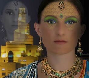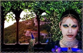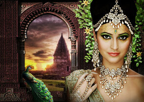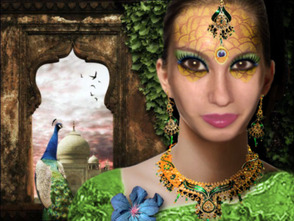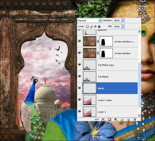 Убедитесь, что рабочий документ с принцессой-павлин открыт, выберите все слои и группы, добавьте их все в группу под названием «Принцесса-павлин». Перетащите эту группу в документ «Индийская сцена», измените размер модели и расположите, как показано ниже. (Если вы заметили белую тонкую линию слева от модели, вы должны удалить ее со слоя «Модель» в группе «Девушка»).
