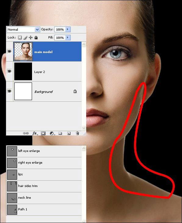 Теперь, когда у нас позади модели черный фон, вы наверняка заметили белые блики по краям модели, мы должны их удалить. Откройте в палитре слоев вкладку Paths (Контуры), там вы увидите контур «hair sides trim» (Если вы используете свое изображение модели, нарисуйте свой контур с помощью Pen Tool (Перо)), сгенерируйте выделение, нажав Ctrl + Enter, и добавьте Feather (Растушевка) 3px, затем нажмите клавишу Delete, чтобы удалить белые края волос.