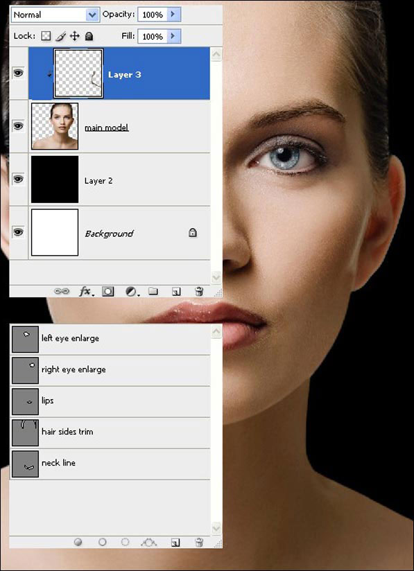 Теперь нам нужно увеличить и добавить небольшой наклон глазам, чтобы придать им азиатский вид. Перейдите на вкладку Paths (Контуры), выберите контур «left eye enlarge», либо создайте контур вокруг левого глаза с помощью Pen Tool (Перо). Сгенерируйте выделение, нажмите Ctrl +J, чтобы дублировать его на новый слой. Теперь нажмите Ctrl +T, поверните немного вправо, затем удерживая клавишу Shift, потяните за верхний левый угол рамки и увеличьте глаз примерно на 10%, затем нажмите Enter, чтобы снять рамку. Теперь добавьте маску к слою «Левый глаз». Выберите мягкую круглую Brush (Кисть) размером 100px и пройдитесь ею по краям расширенного глаза, чтобы соединить с остальной частью лица. Как только закончите, нажмите Ctrl+E, чтобы объединить слои. Теперь выполните то же самое с правым глазом, используя контур «right eye enlarge» в палитре контуров.