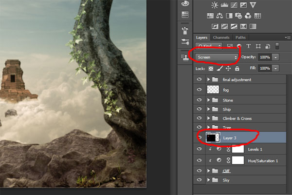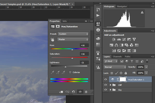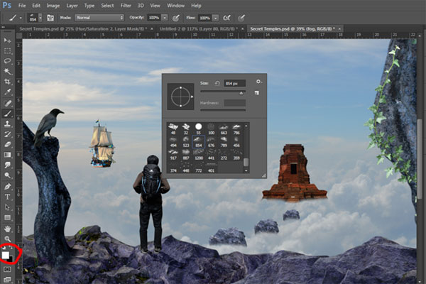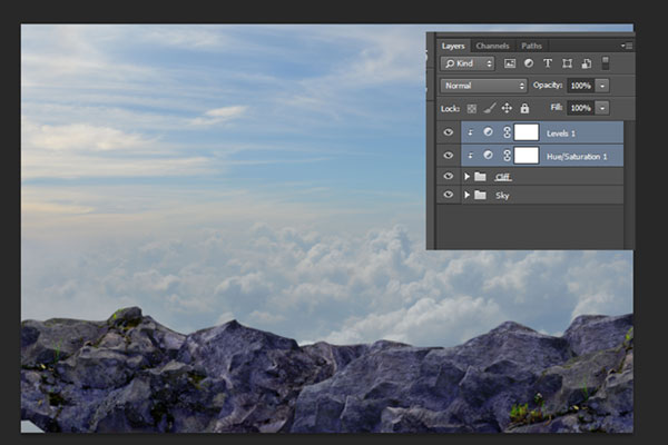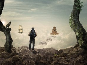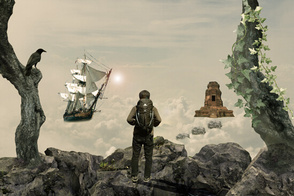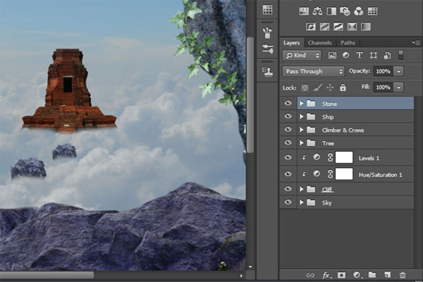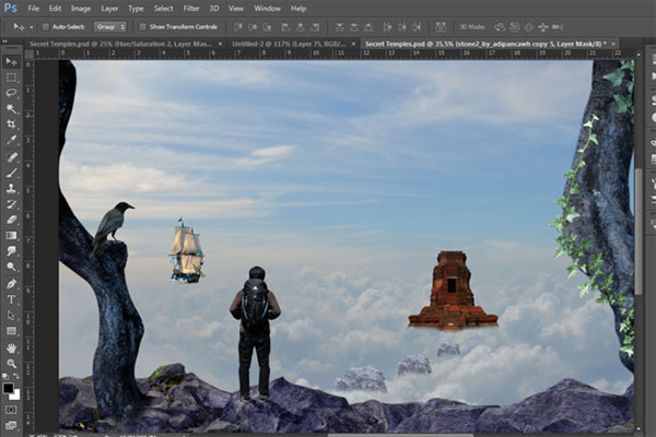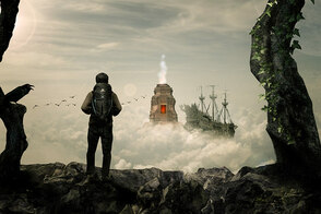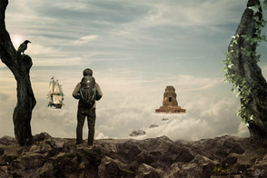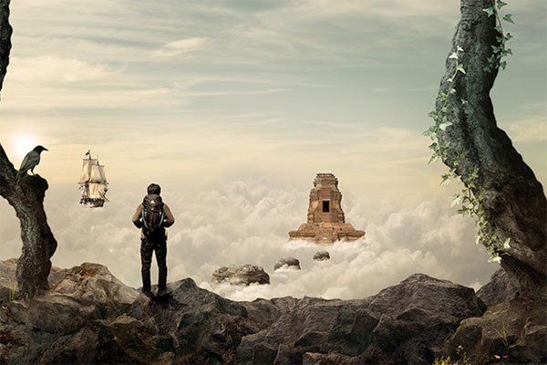 По сюжету композиции путешественник-скалолаз, взобравшись выше облаков, обнаруживает таинственный храм, парящий над облаками и корабль неподалеку от него, так же парящий в воздухе. Для создания этого образа мы начнем с небесного фона. Затем добавим несколько камней-скал, чтобы создать обрыв, на котором расположим нашего скалолаза, затем добавим храм, ворон и деревья. В завершение, сделаем цветовую схему композиции более теплой. Для выполнения данного урока вам потребуется Photoshop CS5 или более поздняя версия.
