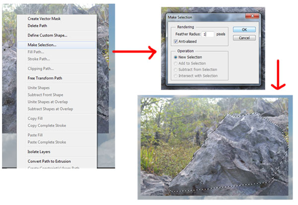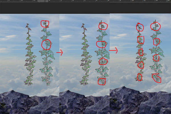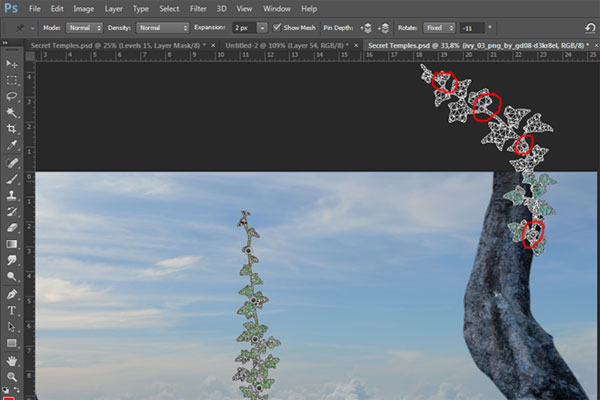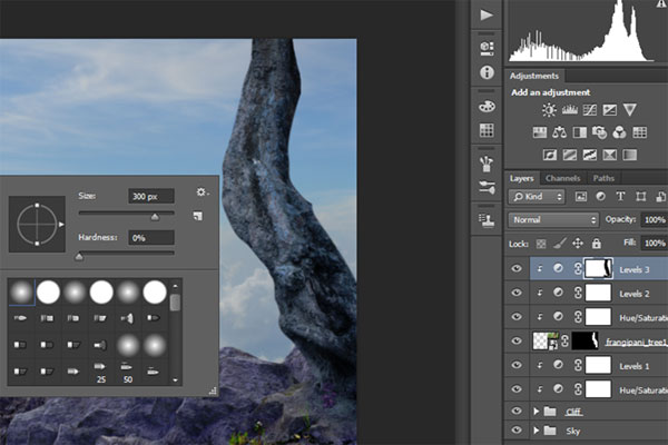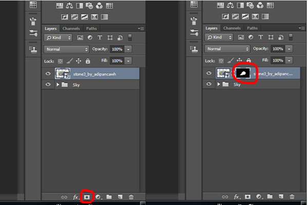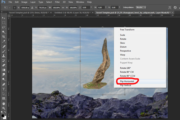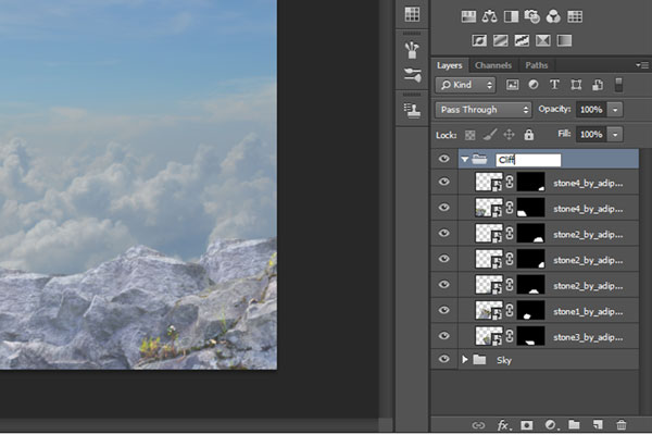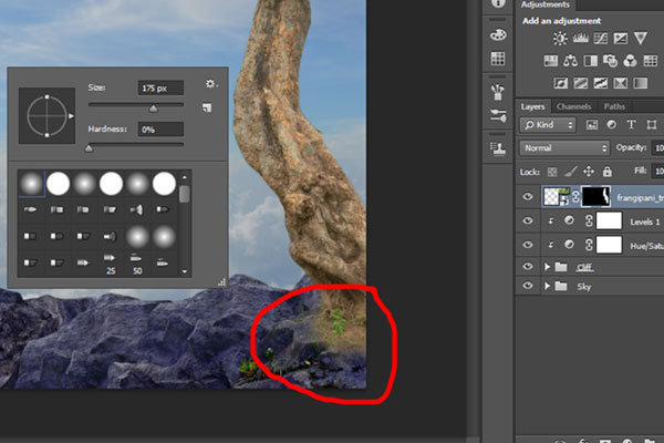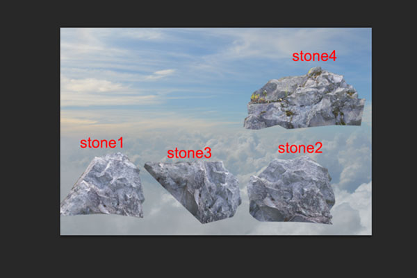 Подкорректируйте размеры камня при помощи Свободной трансформации (Ctrl+T), расположите его, как показано на изображении ниже. Выберите мягкую кисть и замаскируйте нижние края камня. Затем создайте еще несколько копий камня и повторите этот шаг для копий.