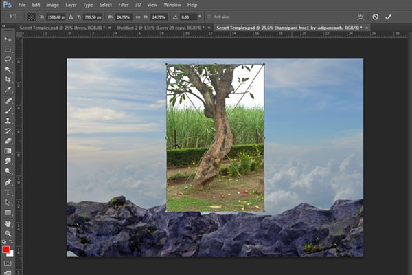 Добавьте фотографию с храмом через меню File> Place (Файл > Поместить). Затем используя свободную трансформацию (Ctrl+T), расположите храм, как показано на рисунке ниже:
