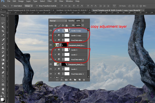 Теперь дублируйте слой «Камень 3» (кликните по нему и нажмите Ctrl+J), и расположите его выше всех слоев.