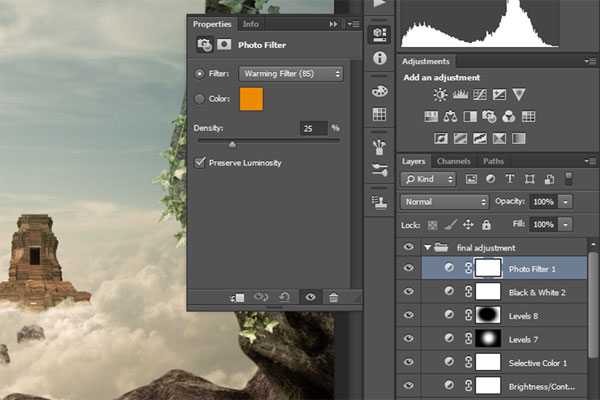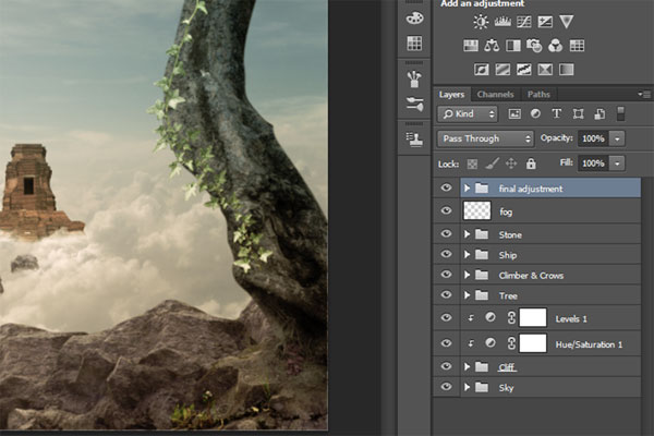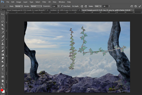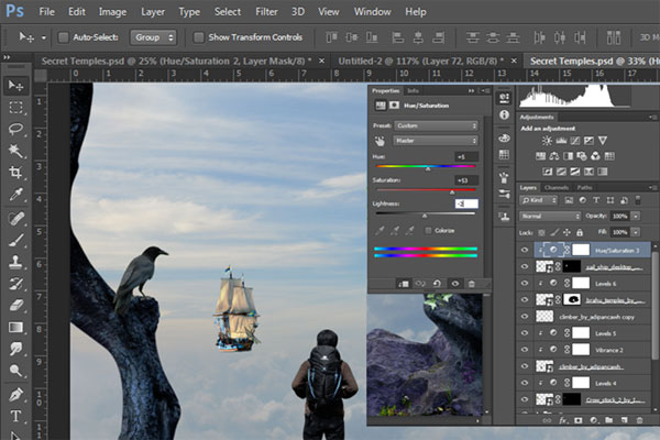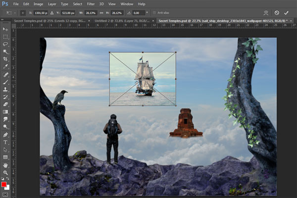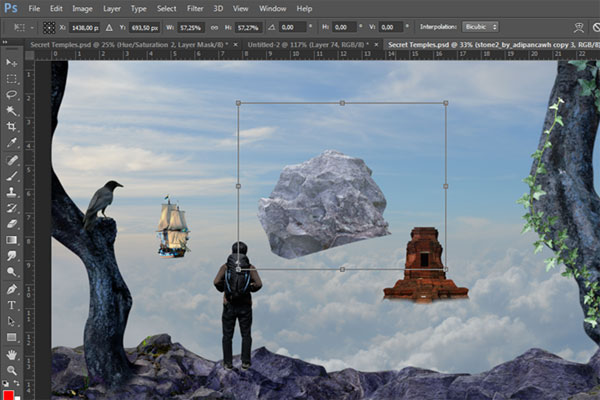В этом уроке вы узнаете, как создать сюрреалистичную композицию с альпинистом, который неожиданно для себя обнаруживает таинственный храм на заоблачной высоте. В этом уроке вы узнаете, как создать свой собственный горный пейзаж, используя для этого несколько стоковых изображений с камнями, расположить персонаж на сцене с реалистичным освещением и тенями, и, в завершение, преобразовать оттенки композиции в более теплые и приятные. На протяжении всего урока вы узнаете методы, которые помогут вам создать лучшие композиции.