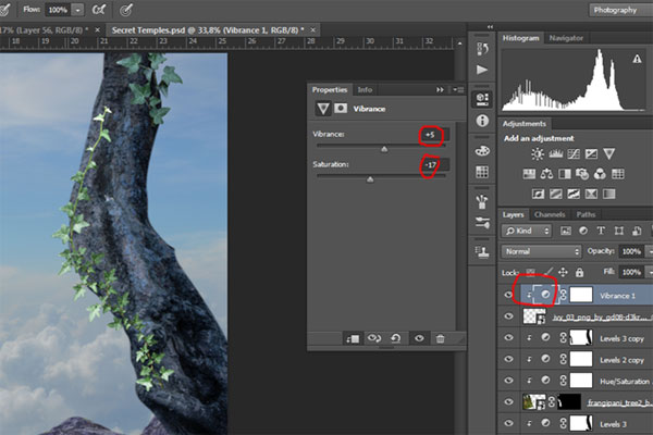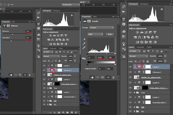 Создайте новые корректирующий слой Vibrance (Вибрация) через меню Layer> New Adjustment Layer> Vibrance (Слой>Новый корректирующий слой>Вибрация) и корректирующий слой Levels (Уровни) через меню Layer> New Adjustment Layer> Levels (Слой>Новый корректирующий слой>Уровни), установите параметры, как показаны ниже, и создайте Clipping Mask (Обтравочную маску)