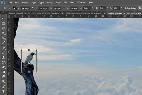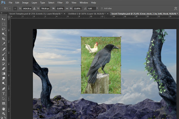 (Перо) выделите ворону и создайте слой-маску (шаг 11). Затем используя свободную трансформацию (Ctrl+T), расположите, как показано на рисунке ниже: