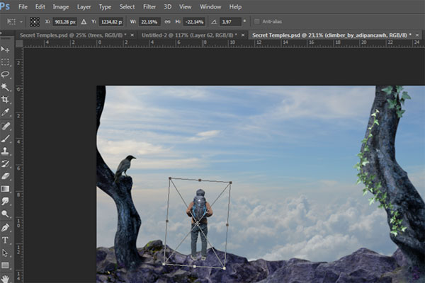 Добавьте фотографию с альпинистом через меню File> Place (Файл > Поместить). Затем используя свободную трансформацию (Ctrl+T), слегка наклоните и расположите скалолаза, как показано на рисунке ниже: