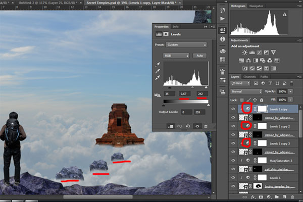 (Перо), обведите контур храма, образуйте выделенную область, создайте слой-маску (шаг 11). Используя свободную трансформацию (Ctrl+T), расположите храм, как показано ниже. Затем создайте корректирующий слой Levels (Уровни) через меню Layer> New Adjustment Layer> Levels (Слой>Новый корректирующий слой>Уровни), установите параметры, как показаны ниже, и создайте Clipping Mask (Обтравочную маску)