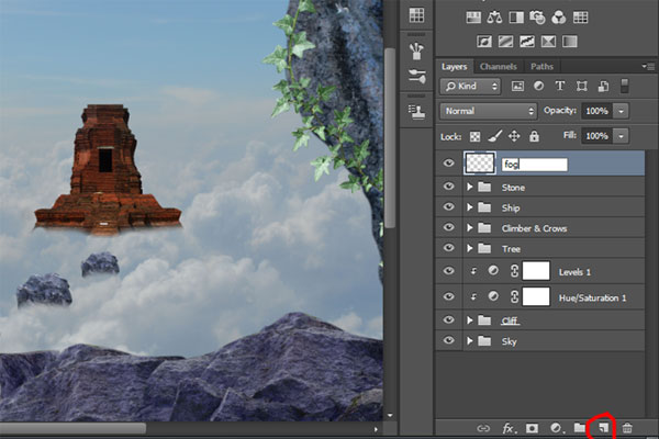 Теперь создайте новый слой (кликните по иконке в нижней части палитры слоев), и назовите его «Туман»