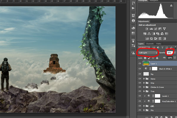 Затем установите режим наложения Soft Light (Мягкий свет) с Opacity (Непрозрачность) 40%.
