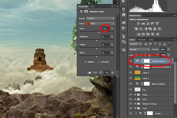 Создайте новый корректирующий слой Selective Color (Выборочная коррекция цвета) через меню Layer> New Adjustment Layer> Selective Color (Слой>Новый корректирующий слой> Выборочная коррекция цвета), установите параметры, как показано ниже. Затем измените Opacity (Непрозрачность) 50%.