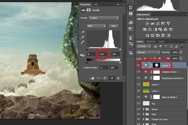 Создайте корректирующий слой Levels (Уровни) через меню Layer> New Adjustment Layer> Levels (Слой>Новый корректирующий слой>Уровни). Примените показанные ниже установки и создайте обтравочную маску (повторите этот процесс для каждого слоя с добавленными камнями)