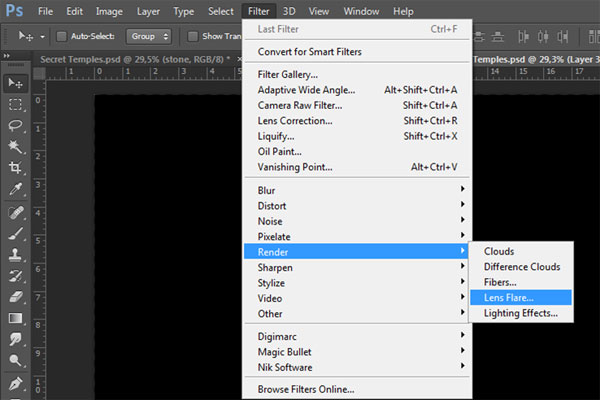 Пройдите в меню Filter > Render > Lens flare (Фильтр > Рендринг > Блик)