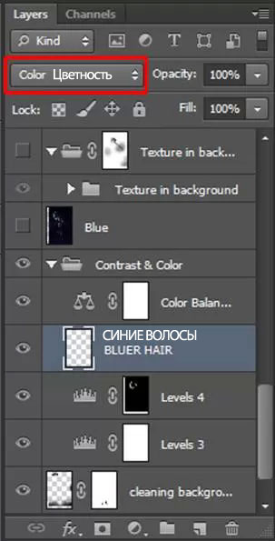 Создайте новый слой поверх всех остальных слоёв, назовите этот слой ‘СИНИЕ ВОЛОСЫ’. Поменяйте режим наложения для данного слоя на Цветность (Color). Поменять режим наложения можно в верхней панели палитры слоёв.
