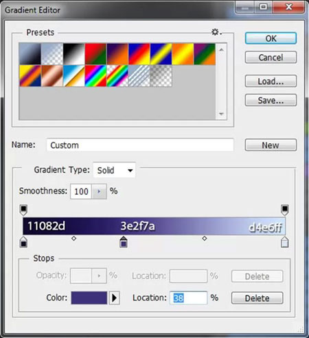 На мой взгляд, картина будет выглядеть намного лучше, если мы ещё добавим синие и сиреневые тона. Чтобы добиться этого эффекта, добавьте новый корректирующий слой Карта Градиента (Gradient Map), установите цвета градиента, как показано на скриншоте ниже.