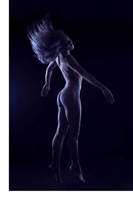 (Eyedropper Tool (I) + отберите образец тёмно-синего оттенка с изображения заднего фона. Прокрасьте поверх нижней части изображения с моделью. Повторите предыдущее действие, отобрав уже другой цветовой оттенок, почаще варьируйте цветовой оттенок, чтобы создать красивый градиент и получить наиболее реалистичный результат.
