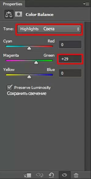 Чтобы добавить больше контраста к изображению, мы добавим зелёных оттенков к тоновому балансу: Света (highlights).