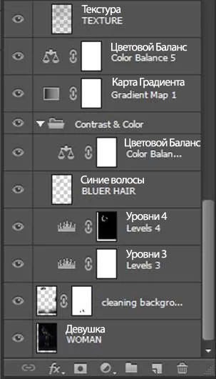 На скриншоте ниже вы можете увидеть порядок слоёв в палитре слоёв на данный момент.