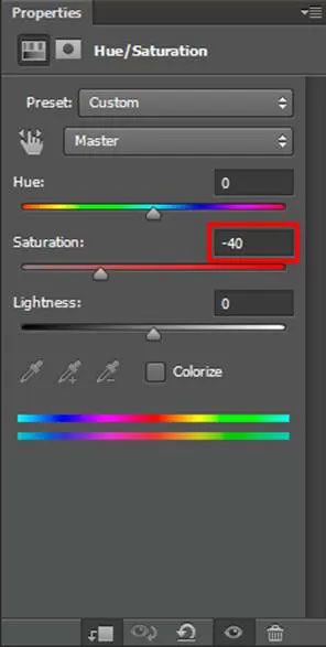 Чтобы сделать цветовую коррекцию немного нежнее, добавьте новый корректирующий слой Цветовой тон / Насыщенность (Hue/Saturation) поверх всех остальных слоёв. Установите значение Насыщенности (Saturation) на -40. Также преобразуйте данный корректирующий слой в обтравочную маску.