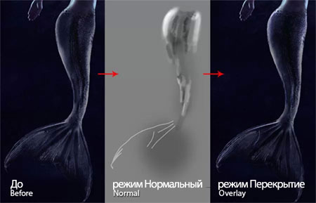 Давайте дополнительно сфокусируемся на светотенях на хвосте русалки. Цель этого Шага заключается в создании плавного перехода на хвосте, чтобы хвост выглядел более элегантно.