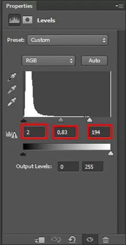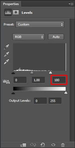 Добавьте ещё один корректирующий слой Уровни (Levels) поверх всех остальных слоёв. Установите Входные значения (Input Levels), которые указаны на скриншоте ниже.