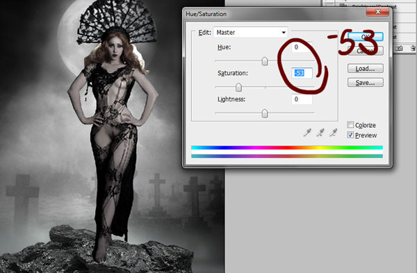 Теперь для этого же слоя со скалой Layer 2 понизьте Saturation(Насыщенность) через меню Image>Correction> Hue/Saturation(Изображение>Коррекция>Цветовой тон/Насыщенность)