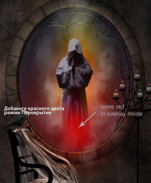 Создайте ещё один новый слой в качестве обтравочной маски поверх предыдущего слоя внутри всё той же группы. Поменяйте режим наложения для данного слоя на Перекрытие (overlay). С помощью мягкой круглой кисти непрозрачностью примерно 20%, прокрасьте кистью красного цвета вокруг изображения окна, куда указывают красные стрелки в качестве ориентира. Продублируйте слой, чтобы эффекты освещения сделать более живыми