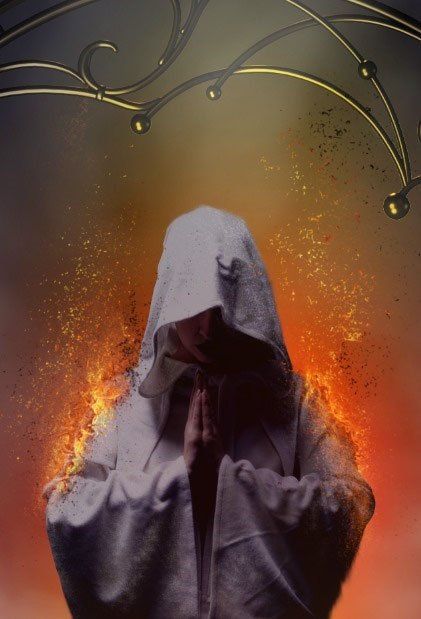 Далее, мы нарисуем эффект огня над головой модели. Создайте новый слой поверх слоя с группой ‘Огонь на плечах’. Находясь на новом слое, с помощью белой кисти, нарисуйте частицы огня и огонь вокруг и над головой модели.