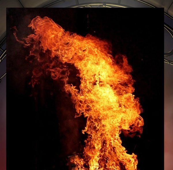 Далее, откройте стоковое изображение ‘Огонь’. Переместите данное изображение на наш рабочий документ, расположив поверх правого плеча. Примените масштабирование к изображению с огнём, а затем преобразуйте данный слой в обтравочную маску.