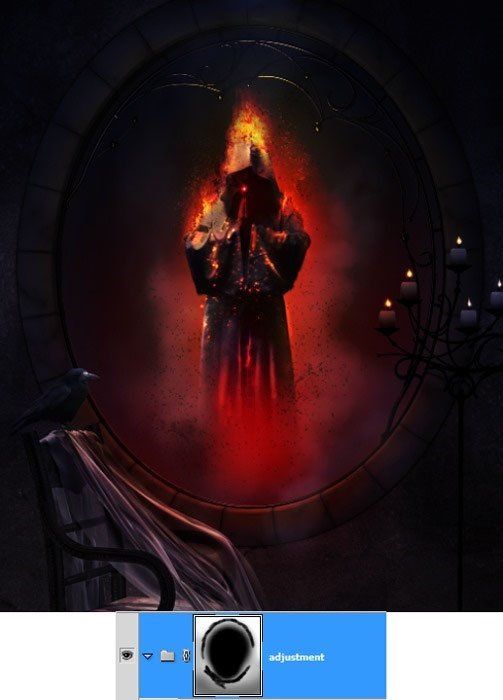 В заключение, перейдите на слой-маску корректирующего слоя Микширование каналов (channel mixer), скройте коррекцию вокруг изображения дьявола, нижней части окна и огоньков свечей.
