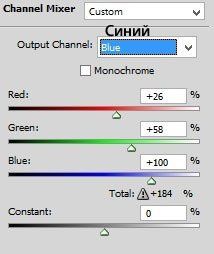 Ещё раз идём Слой – Новый корректирующий слой – Микширование каналов (layer > new adjustment layers > channel mixer), чтобы добавить новый корректирующий слой поверх всех слоёв. Примените настройки, которые указаны на скриншоте ниже: