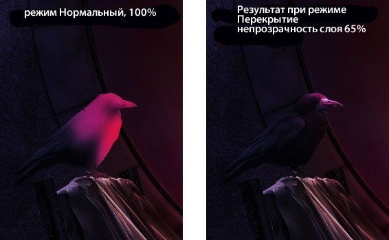 Создайте ещё один новый слой поверх предыдущего слоя внутри всё той же группы. Находясь на новом слое, ещё раз прокрасьте красным оттенком по изображению ворона. Поменяйте режим наложения для данного слоя на Мягкий свет (soft light). На скриншоте ниже, вы можете определить степень прокрашивания красной кистью при режиме Нормальный (normal), далее, я уменьшил непрозрачность данного слоя до примерно 70%.