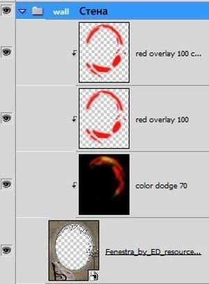 В заключение, мы проведём коррекцию окна, добавив эффекты освещения. В основном, мы используем ту же самую технику, которую мы использовали в предыдущих шагах. Перейдите на слой с группой ‘Стена’. Зайдите в папку. Внутри группы, создайте новый слой в качестве обтравочной маски поверх самого верхнего слоя с окном. Залейте этот слой чёрным цветом, а затем поменяйте режим наложения для данного слоя на Осветление основы (color dodge). Находясь на новом слое, прокрасьте мягкой красной, а затем жёлтой кистью вокруг верхней и левой части окна. На скриншоте ниже, вы можете определить степень прокрашивания кистью при режиме Нормальный (normal), далее, я уменьшил непрозрачность данного слоя до примерно 70%.