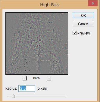 Заключительный шаг: перейдите на самый верхний слой в палитре слоёв (слой с корректирующим слоем Микширование каналов (channel mixer). Нажмите клавиши (Shift+Ctrl+Alt+E), чтобы объединить все видимые слои в один новый слой. Находясь на объединённом слое, идём Слой- Смарт-объект – Преобразовать в смарт-объект (layer > smart object > convert to smart object). Данное действие преобразует объединённый слой в Смарт-объект (smart object). Далее, идём Фильтр – Другие – Цветовой Контраст (filter > others > high pass). Примените настройки, которые указаны на скриншоте ниже: