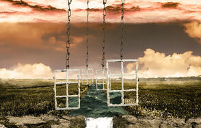 Откройте изображение цепи и отделите от фона. Переместите в рабочий документ. Путём копирования слоя с цепью, создайте цепи. Далее откройте изображение рамы, отделите от фона и поместите в работу. Создайте несколько копий, уменьшите размер и подвесьте их на цепях. Понизьте непрозрачность слоёв с дальними рамами.