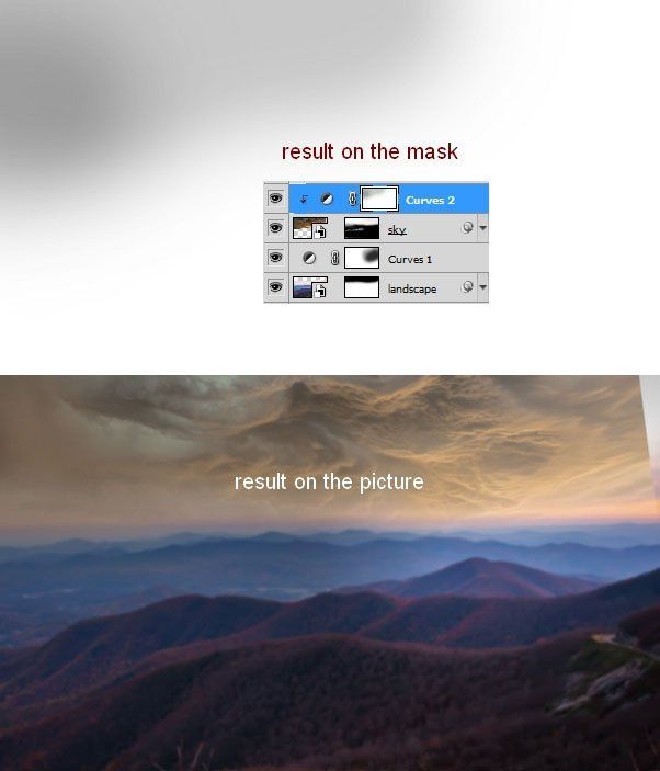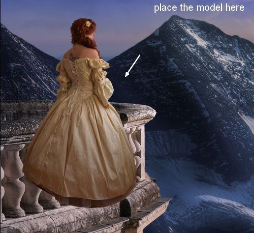 Откройте фотографию гор и отделите горы от неба. Перенесите их в основной документ и расположите, как показано на скриншоте.