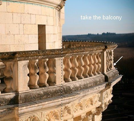 Откройте фотографию балкона в Фотошопе. Выделите часть балкона и перенесите её в основной документ.