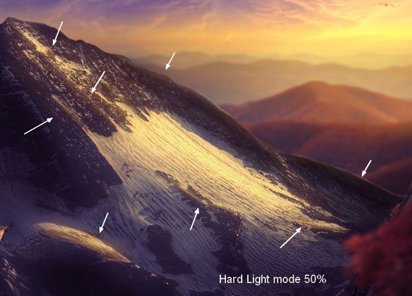 Создайте новый слой и жёсткой кистью нарисуйте свечение на краях снежной горы. Установите режим наложения Жёсткий свет (Hard Light) и уменьшите непрозрачность до 50%.