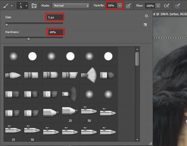 Выберите инструмент Кисть (Brush Tool (B). Установите мягкую круглую кисть, размер кисти 100px, непрозрачность кисти 15%.