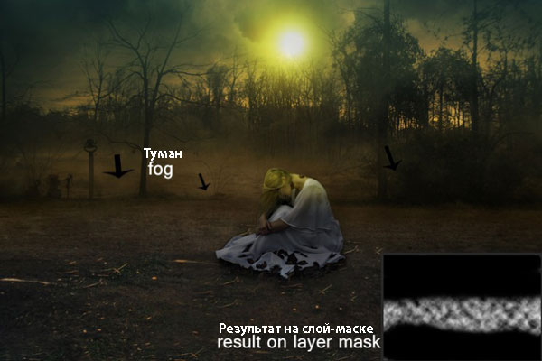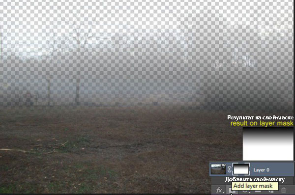 Примечание переводчика: цвет кисти белый, автор прокрашивает область деревьев на слой-маске слоя с туманным утром, главное не переусердствуйте, чтобы не потерять эффект тумана.