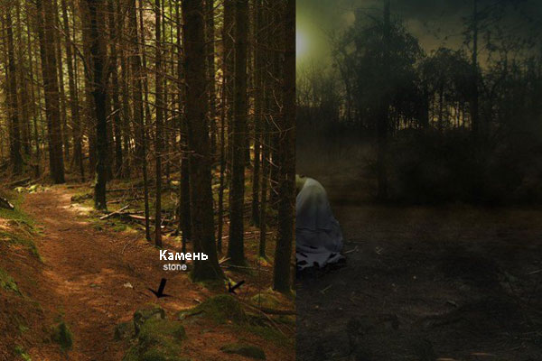 Далее, мы добавим камни к нашей сцене. Откройте изображение с тёмным лесом. Переместите данное изображение наш рабочий документ, расположив слой с тёмным лесом поверх слоя с группой ‘Модель’. Я хочу оставить только изображение камней.