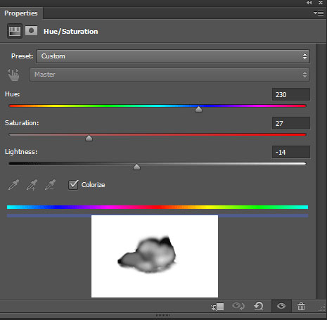 Далее, добавьте корректирующий слой Цветовой тон / Насыщенность (Hue/saturation). Установите значение Цветового тона (Hue0 на +230, а значение Насыщенности (saturation) на +27 и Яркости (lightness) на -14. Перейдите на слой-маску данного корректирующего слоя. Далее, с помощью мягкой чёрной кисти непрозрачностью и нажимом 30%, прокрасьте поверх платья модели, как показано на скриншоте ниже.