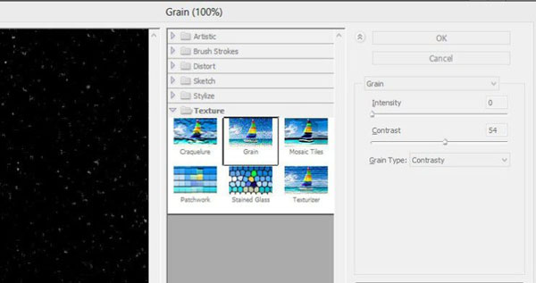 Далее, идём Фильтр – Шум – Добавить шум (filter Noise> add noise), установите значение шума 80%, также поставьте галочку в окошке Монохромный (monochromatic). Далее, идём Фильтр – Галерея фильтров – Текстура – Зерно (filter>filter gallery>texture>Grain). В настройках фильтра, установите значение Интенсивности (intensity) 0, Контрастность (contrast) 54, а Тип зерна (grain type) Контрастные (contrasty).