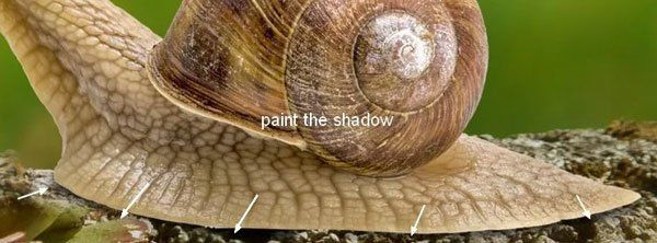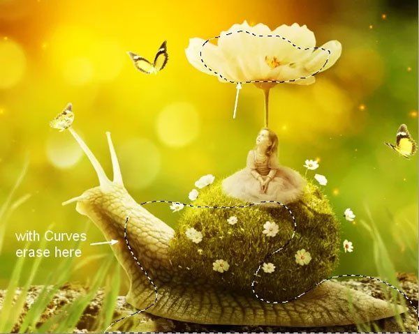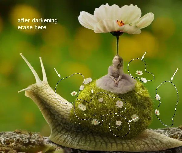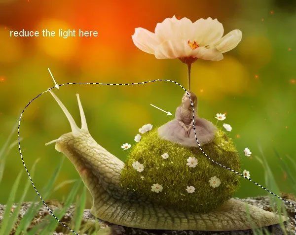 На маске, используя мягкую чёрную кисть сотрите верхнюю часть на улитке, чтобы создать эффект освещения от нашего источника света, который мы мысленно расположили в левом верхнем углу. Работая кистью, ориентируйтесь на выделенную область на скриншоте ниже.