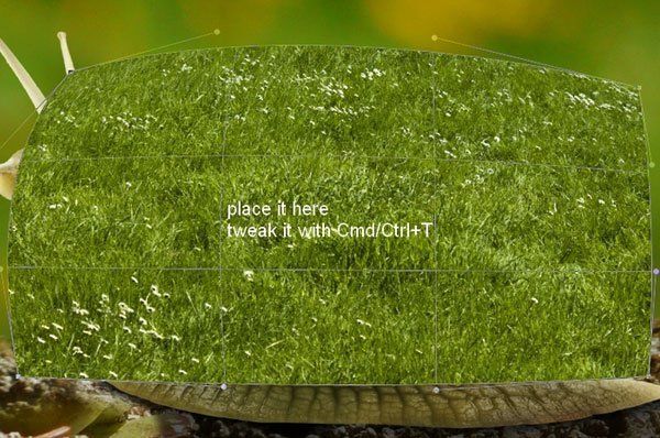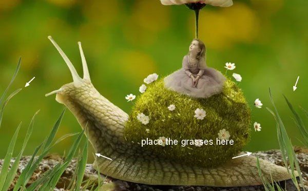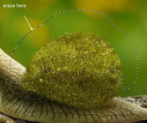 Добавьте маску и мягкой кистью оставьте траву только на раковине улитки. Чтобы края травы не были плоскими, используйте жёсткую 3-4 пиксельную кисть (лучше, если вы будете использовать планшет).