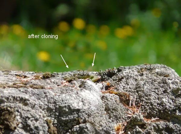 Откройте фоновую фотографию в Фотошопе. Нам нужно избавиться от растения на камне. Создайте новый слой (Ctrl + Shift + Alt + N) и инструментом Штамп (Clone Stamp Tool) (S) замажьте его.